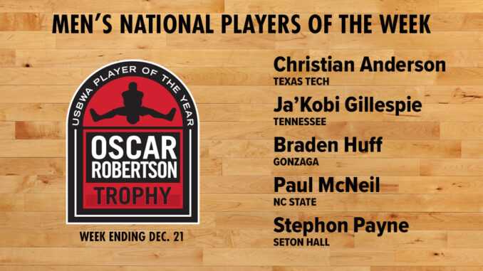 • Week ending Dec. 21: Christian Anderson, Texas Tech; Ja’Kobi Gillespie, Tennessee; Braden Huff, Gonzaga; Paul McNeil, NC State; Stephon Payne, Seton Hall.