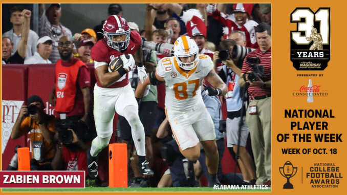 DALLAS (FWAA) – Alabama cornerback Zabien Brown produced one of the highlights plays of this past weekend’s games, intercepting a Tennessee pass intended for the Crimson Tide end zone and taking it back 99 yards for a touchdown, a back-breaking pick-six in the final moments of the first half in its 37-20 win over the Vols. That play, plus his pass coverage that allowed only 16 yards, earned Brown the Bronko Nagurski National Defensive Player of the Week for the weekend of Oct. 18 by the Football Writers Association of America.