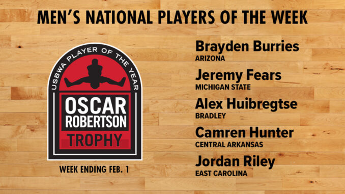 INDIANAPOLIS (USBWA) – The U.S. Basketball Writers Association has named five Oscar Robertson National Players of the Week for games of the week ending Sunday, Feb. 1.
