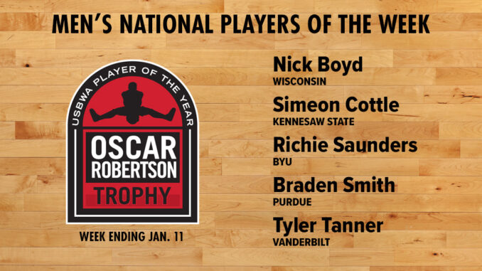 INDIANAPOLIS (USBWA) – The U.S. Basketball Writers Association has named five Oscar Robertson National Players of the Week for games of the week ending Sunday, Jan. 11.