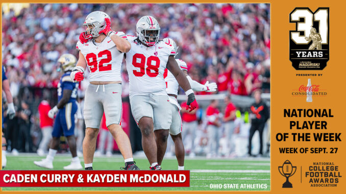 DALLAS (FWAA) – Ohio State’s inside-outside defensive force of Kayden McDonald at tackle and Caden Curry on the end helped the top-ranked Buckeyes limit Washington to just 61 yards on the ground and take a 24-6 road win in Seattle. Curry’s five tackles for loss tied the school record to go with a career-high 11 tackles, and McDonald’s career-high seven tackles included three for losses that earned the duo a share of the Bronko Nagurski National Defensive Players of the Week for the weekend of Sept. 27, as selected by the Football Writers Association of America.