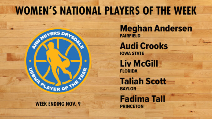 For their performances in the period through Sunday, Nov. 9, the first five Ann Meyers Drysdale national women’s honorees are Fairfield roadrunner Meghan Andersen; Iowa State center Audi Crooks; Florida guard Liv McGill; Baylor guard Taliah Scott; and Princeton guard Fatima Tall. The first Tamika Catchings freshman of the week goes to USC guard Jazzy Davidson, and the team of the week is reigning NCAA champion UConn.