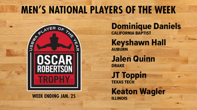INDIANAPOLIS (USBWA) – The U.S. Basketball Writers Association has named five Oscar Robertson National Players of the Week for games of the week ending Sunday, Jan. 25.