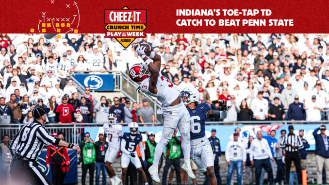 DALLAS (FWAA) – Indiana is the winner of the Cheez-It Crunch Time Play of the Week for Week 11 for Omar Cooper Jr.’s remarkable touchdown catch in the back of the Penn State end zone that kept the Hoosiers unbeaten, as selected by the All-America Commitee of the Football Writers Association of America.