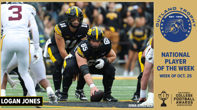 DALLAS (FWAA) – Iowa dominated Minnesota early on and continued to pound the ball throughout its 41-3 win over their Big Ten rival. In the middle of the offensive line that graded as the country’s best last weekend is center Logan Jones. For his role in keeping the Floyd of Rosedale Trophy in Iowa for another season, Jones is the Outland Trophy National Player of the Week honor for games during the weekend of Oct. 25, as selected by the Football Writers Association of America.