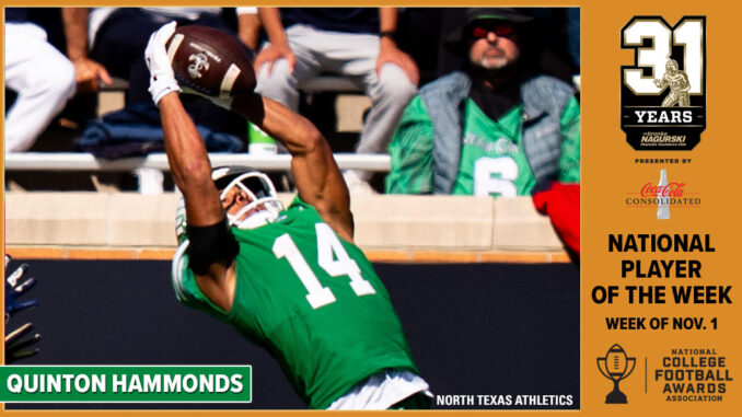 DALLAS (FWAA) – North Texas safety Quinton Hammonds snagged two second-half interceptions to stall any Navy comeback as the Mean Green ended the Midshipmen’s undefeated run with a 31-17 home win. For his two picks to go with four tackles that helped North Texas keep pace at the top of the American Conference standings, Hammonds earned the Bronko Nagurski National Defensive Player of the Week for the weekend of Nov. 1, as selected by the Football Writers Association of America.