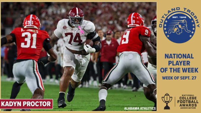DALLAS (FWAA) – Alabama offensive tackle Kadyn Proctor played every snap in Saturday’s knock-down, drag-out win over Georgia and graded out at a team-high 89 percent as the Crimson Tide made a statement to open SEC play with a 24-21 road win in Sanford Stadium. For his play not allowing a quarterback pressure or a sack protecting and blocking for an Alabama offense that helped end Georgia’s 33-game home win streak, Proctor has earned the Outland Trophy National Player of the Week honor for games during the weekend of Sept. 27, as selected by the Football Writers Association of America.