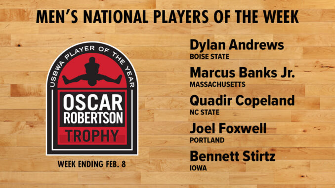 INDIANAPOLIS (USBWA) – The U.S. Basketball Writers Association has named five Oscar Robertson National Players of the Week for games of the week ending Sunday, Feb. 8.