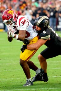 Bishop Fitzgerald of USC – shoving Antonio Harris of Purdue out of bounds after a 15-yard gain