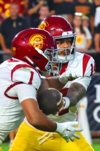 Jayden Maiava of USC – handing off to Eli Sanders of USC