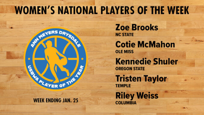 For the period through Sunday, Jan. 25, the five Ann Meyers Drysdale national women’s honorees of the week are NC State guard Zoe Brooks; Ole Miss forward Cotie McMahon; Oregon State guard Kennedie Shuler; Temple guard Tristen Taylor; Columbia guard Riley Weiss. The Tamika Catchings freshman of the week is Oklahoma guard Aaliyah Chavez, and the team of the week is Iowa.