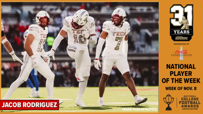 DALLAS (FWAA) – Texas Tech linebacker Jacob Rodriguez was a constant nemesis against BYU on Saturday with a team-high 14 tackles and came up with an interception and a fumble recovery as the Red Raiders moved atop the Big 12 standings with a 29-7 win. For his play leading a defense that halted one of the nation’s top offenses, Rodriguez earned the Bronko Nagurski National Defensive Player of the Week again for the weekend of Nov. 8, as selected by the Football Writers Association of America.
