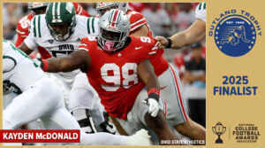 - Kayden McDonald, DT, Ohio State (#98, 6-3, 326, Jr., Suwanee, Ga.): McDonald leads defensive line for unbeaten and top-ranked Ohio State and is fifth on the team with 47 tackles, an impressive number from his defensive tackle position. He also lists third on the team with 8.0 tackles for loss and has 3.0 sacks. His two season-high tackle counts this season – eight – have come against Texas and Penn State and his season-high 3.0 TFL’s came at Washington along with 2.0 sacks. Last week’s 42-9 win over Rutgers was the seventh game this season the Ohio State defense held its opponent to less than 10 points. In fact, the Buekeyes have allowed just 84 points all season. McDonald earned the FWAA’s Bronko Nagurski Trophy National Defensive Player of the Week honor the weekend of Sept. 30 following OSU’s 24-6 win at Washington where he had a career-high 7.0 tackles, 3.0 TFL’s and 2.0 sacks and a hurry.Ohio State has four Outland Trophy winners, its last one being offensive tackle Orlando Pace in 1996.