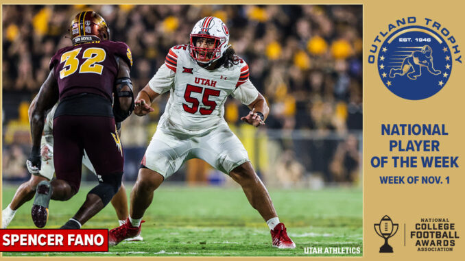 DALLAS (FWAA) – Utah surged past No. 17 Cincinnati, 45-14, on Saturday with an offense that rolled up 480 total yards powered by dominant push up front. Offensive tackle Spencer Fano played a large role in the key Big 12 win as the highest-graded FBS offensive lineman from last weekend’s games and has earned the Outland Trophy National Player of the Week honor for games during the weekend of Nov. 1, as selected by the Football Writers Association of America.