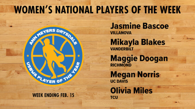 • Week ending Feb. 15: Jasmine Bascoe, Villanova; Mikayla Blakes, Vanderbilt; Maggie Doogan, Richmond; Megan Norris, UC Davis; Olivia Miles, TCU (National); Jazzy Davidson, USC (Freshman); Maryland (Team).